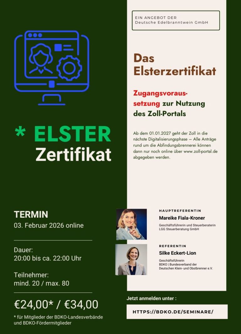 Zielgruppe: Das Online-Seminar richtet sich an alle aktiven und interessierten Brennereibetriebe und Stoffbesitzer:innen. Alle, die bisher noch kein gültiges Elsterzertifikat haben.